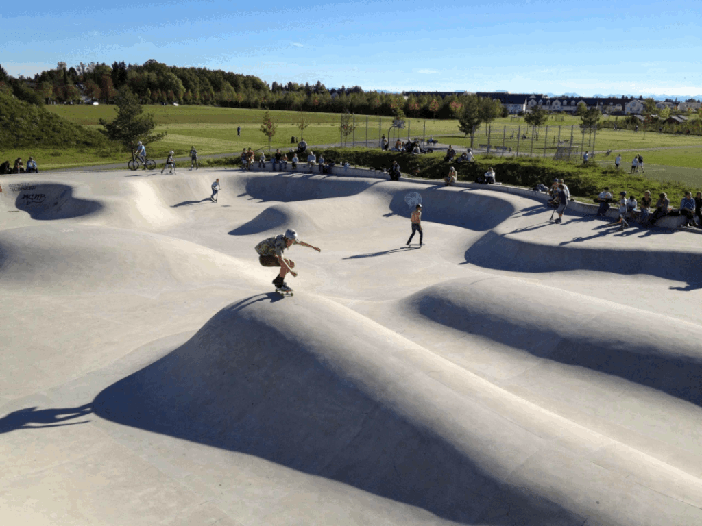 Прямо напротив леса, через дорогу, расположен бетонный скейт-парк Im Gefilde площадью 900 квадратных метров — отличное место для любителей экстрима. Волнистые рампы и плавные изгибы создают ощущение непрерывного движения, помогая обрести столь заветную порцию и скорости, и адреналина.